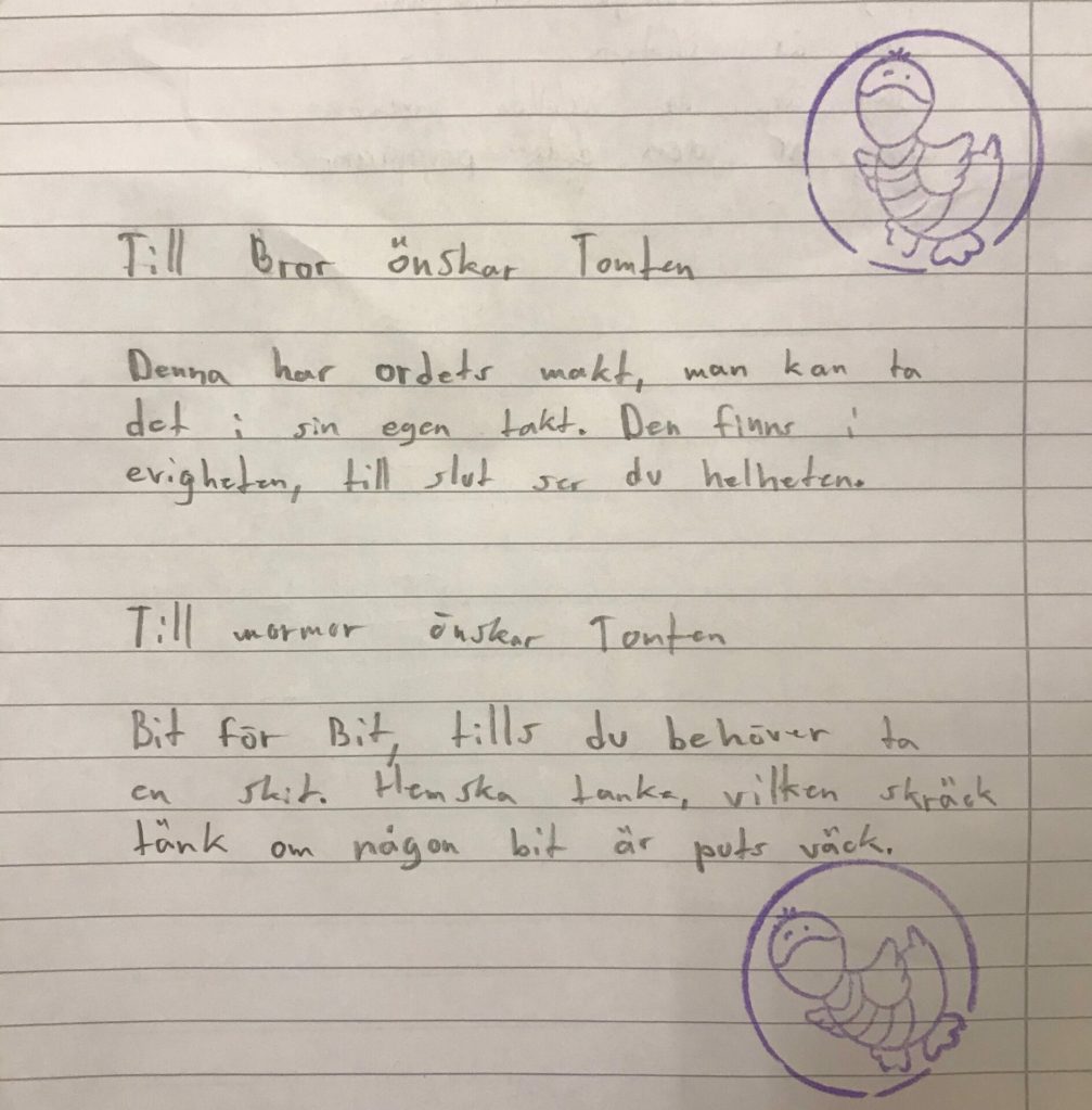 Skriv en ny mening, efter varje mening från texten, som rimmar på slutet (se Boyes text). - Sammanställ dina fem meningar från texten tillsammans med dina fem nya meningar, på samma sätt som Boye har gjort. Skriv en rubrik, e. ”I pandemin”.