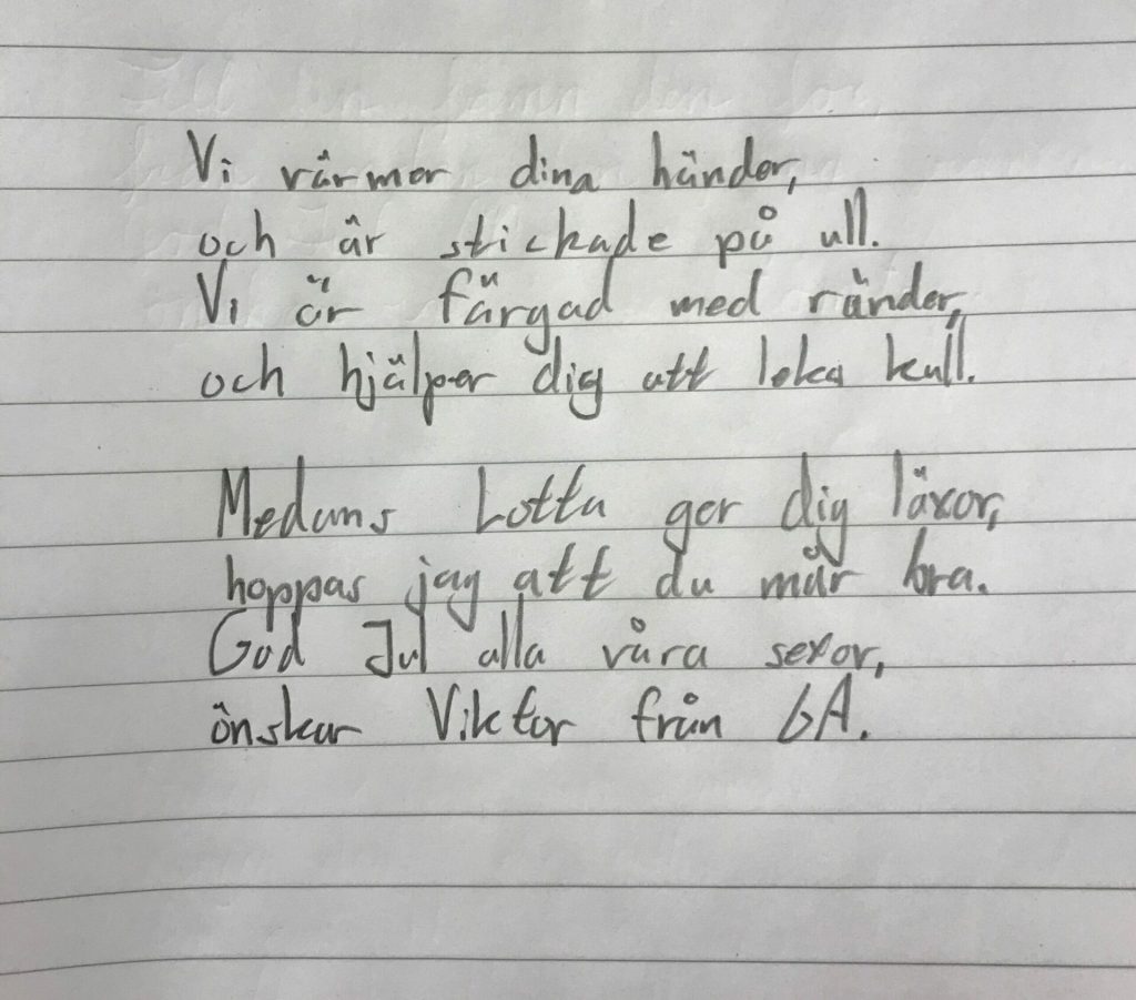 Ok. Det är inte så många elever som skriver julklappsrim, eller får julklappar med rim. Skriv en lista på julklappar och låt eleverna få rimma på klapparna. Obs! Avslöja inte innehållet – det ska mottagaren göra.