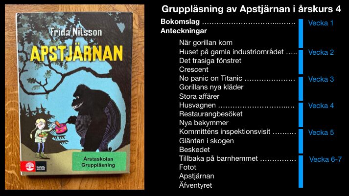 Vi inleder terminen med att läsa Apstjärnan av Frida Nilsson. Det är berättelsen om barnhemsbarnet Jonna som blir adopterad av Gorillan.