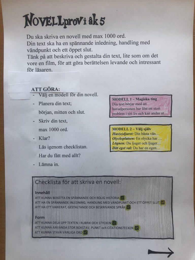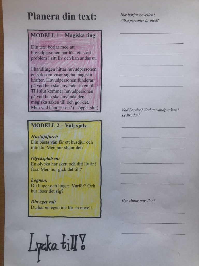 Först läste vi ”Mördaren i parken” och diskuterade vad en novell är. Sedan läste vi och analyserade ett antal olika noveller i smågrupper som inspiration. Efter det läste vi ”Som en fisk i vattnet”, snodde själva idén till texten och skrev en egen novell, under två veckor. Texten läste eleverna hemma som läsläxa. Samma sak med ”Necrophorus vespiloides” och ”En annan Amina”. Under dessa veckor har undervisningen handlat mycket om gestaltningar, stycken, stavning, ledtrådar, rubrik, vändpunkt, dialog, beskrivningar, inledning, öppet slut osv. Till slut blev det ett skrivprov. Ett antal modeller fr noveller presenterades och skrivtiden var 60 min.