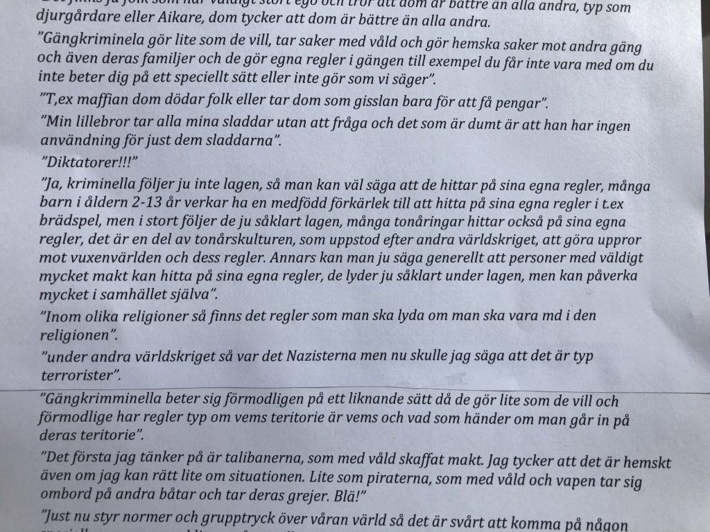 ”Asså jag vet att till exempel Putin med sin ryska armé gör vad de vill, de dödar civila männsikor i Ukraina. Det står att man inte får göra det annars är det en brott. Som man kan bli fängslad för flera år, men de bryr sig inte”.