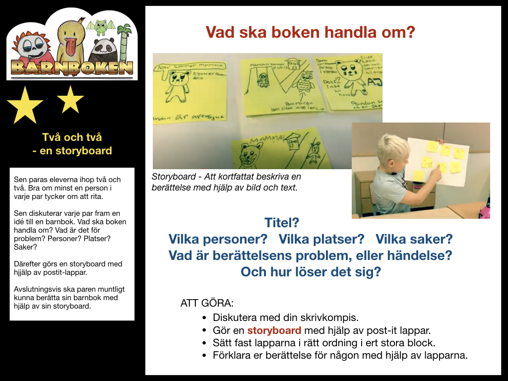När en idé har tagit form gör alla grupper en storyboard med hjälp av skissbilder och korta anteckningar på post-it lappar. Med hjälp av storyboarden berättar de sedan hela sin historia för en annan grupp (för stt se om den håller).