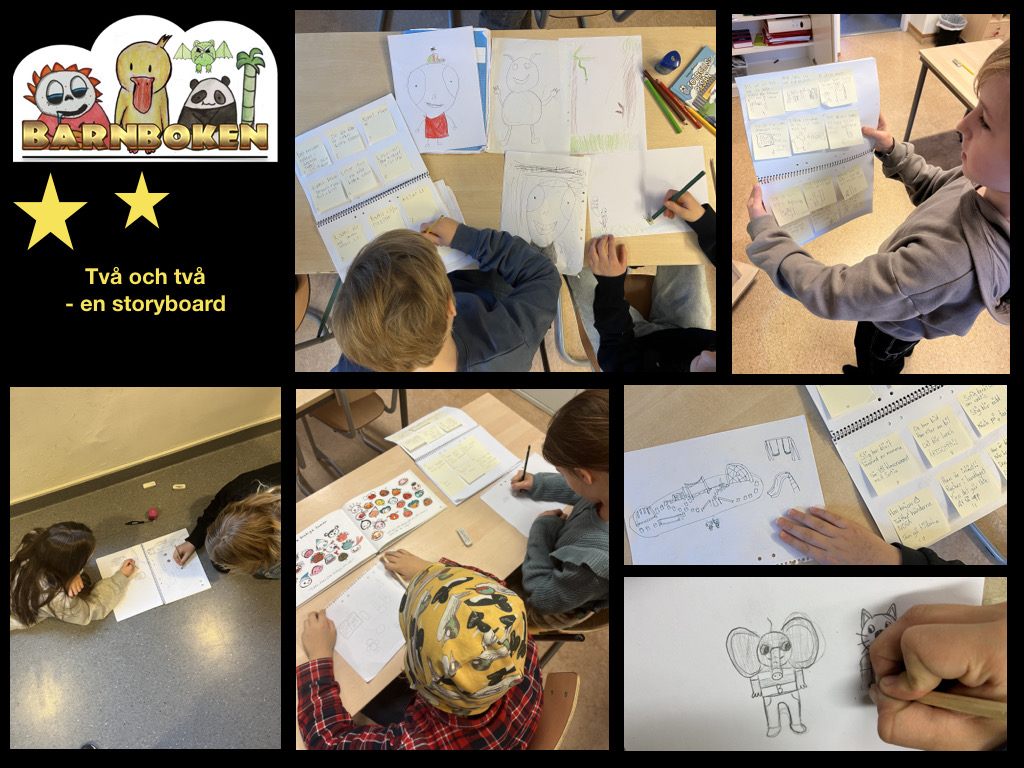 Först diskuterar vi olika förslag på vad en barnbok skulle kunna handla om. Vi har många bra exempel från analysarbetet. Sedan delar jag in eleverna i par, eller grupper om tre. De får sedan skissa på karaktärer och diskutera olika idéer.