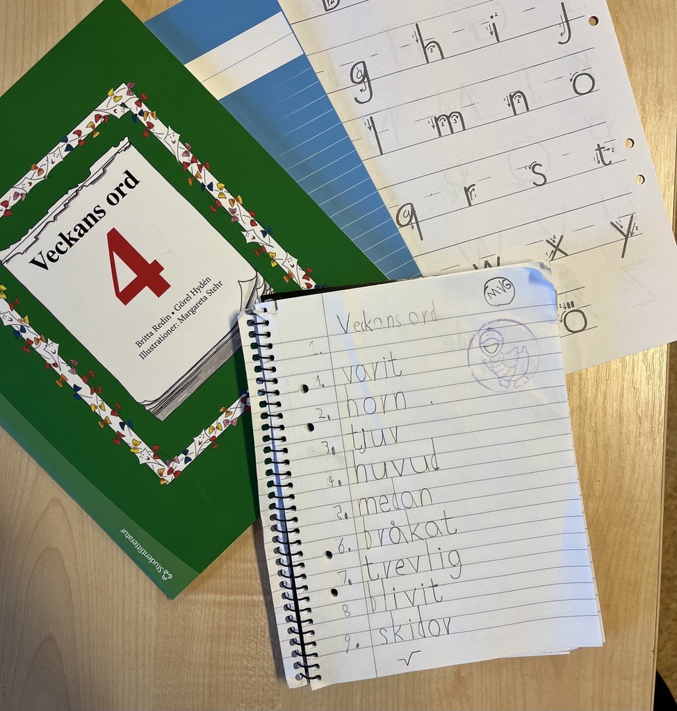 På måndagar går vi igenom veckans kapitel i Veckans ord-boken, ex. ”Kapitel 3 – Lyssna på vokalen”. Sen skriver eleverna upp alla tolv ord i ett skrivhäfte. Viktigt att stava rätt – och att forma bokstäverna rätt. När det är klart tas skrivhäftet och Veckans ord-boken med hem. I skrivhäftet ligger också en instruktion, ”Så formar du bokstäver”, för att kunna öva hemma. Vissa behöver knappt öva medan vissa behöver gjöra det flera gånger. Under veckan repeterar jag veckans ord, påminner om läxan och pratar om orden. Ser till att vi använder dem. Och sedan arbetar eleverna i lugn och ro hemma med läxan. På fredagen tas allt material med tillbaka til skolan. Då har vi också ett litet prov, i ett annat skrivhäfte. Jag kör klassisk diktamen. Säger först ”1. skal. Oskar har ett äpple med grönt skal. Skriv skal.” Alla elever lyssnar och skriver. På slutet går jag igenom alla orden igen. Och till sist går jag runt och rättar och kommenterar elevernas arbete. Något stavfel här och där och några bokstäver som behöver rättas till.