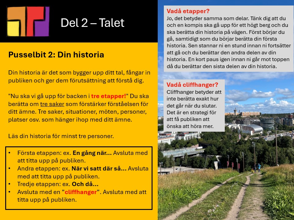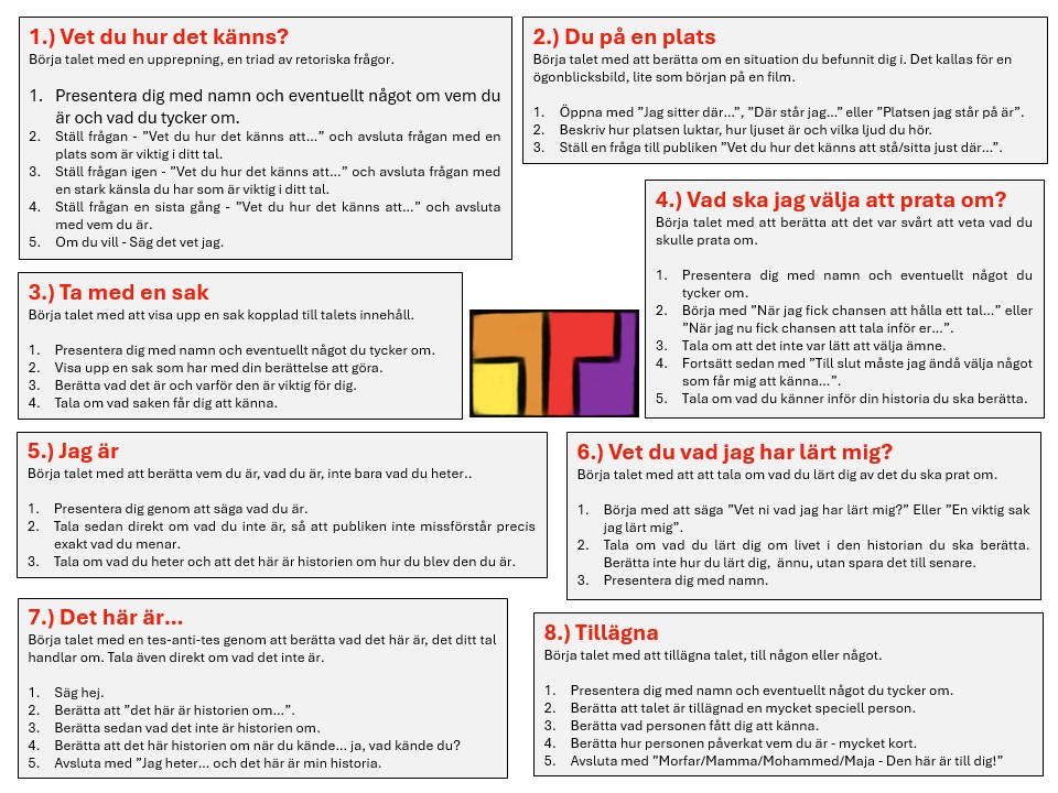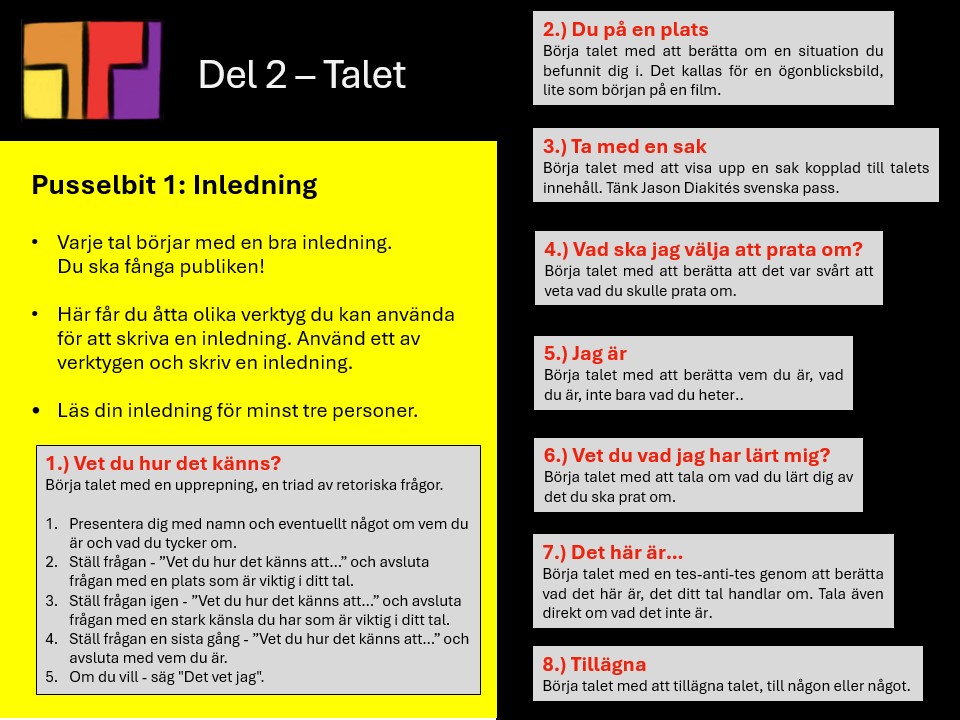 Titta på många olika tal och prata om vad de handlar om och hur de presenteras. Prata också om vad stilfigurer är och låt eleverna upptäcka dem. Titta också på Retorikmatchen från UR. Den ger viktiga pusselbitar, och inte minst att unga talare kan! Glöm inte att identifiera kvaliteter i talen ni lyssnar på. Vad är det som fastnar i minnet? Varför? Och anteckna.