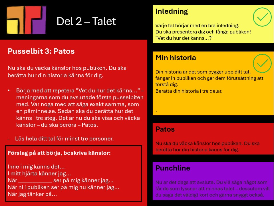 Öva JÄTTEMYCKET! Öva med en kompis, sen två, sen tre osv. Det handlar om att dela både berättelsen och själva talet. Kraften i när eleverna delar med varandra är helt oslagbar. Avsluta lektionerna med att de som vill läsa upp hela/delar av talet högt för klassen. Boka någon slags scen att avsluta eventet på. I år körde vi i skolans matsal. Det gick bra. Var enkelt att få ihop allt det praktiska. Talarna var otroligt nervösa innan själva eventet. Några skakade när de gick upp på scenen. Vi hade en back-drop på scenen och två strålkastare och en mygga med mikrofon. Hade en talarlista på en liten whiteboard så att alla hade koll. Publiken var otroligt bra. Alla visste vad alla gick igenom. Det var en kollektiv spänning i rummet och kärlek och applåder som spred värme i lokalen.
